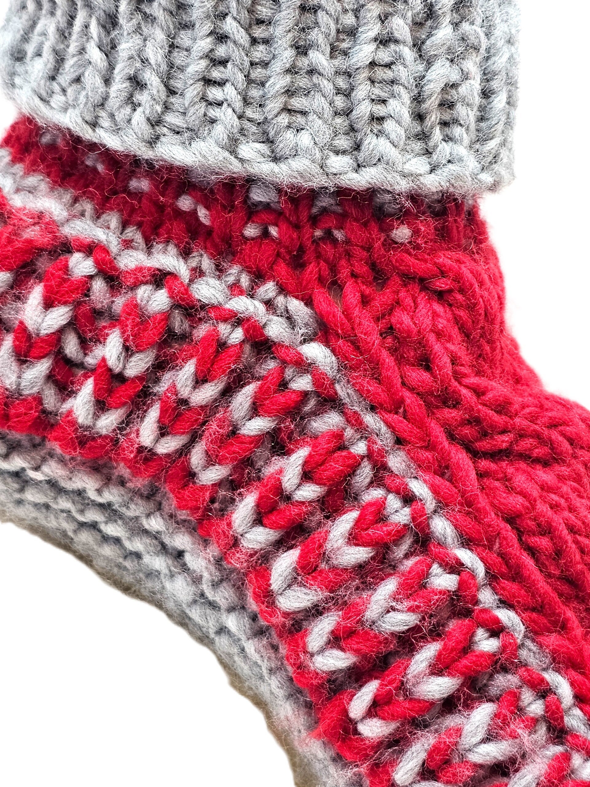 Die abgebildeten Kuschelsocken sind aus rotem Garn gestrickt und haben ein auffälliges Zopfmuster auf der Oberseite. Der Rand der Socken ist mit einem zweifarbigen Muster in Rot und Grau versehen, das sich auch entlang der Sohle fortsetzt. Die Socken wirken sehr warm und gemütlich, ideal für kalte Wintertage.