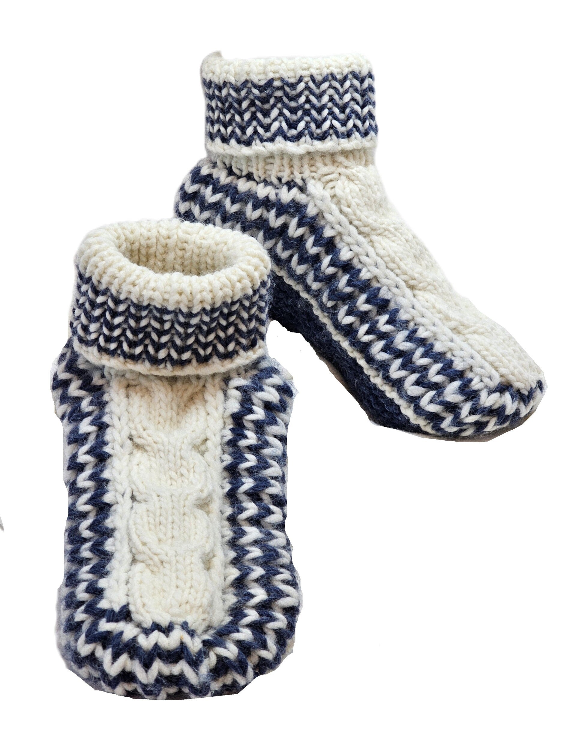 Die abgebildeten Kuschelsocken sind aus weißem Garn gestrickt und haben ein auffälliges Zopfmuster auf der Oberseite. Der Rand der Socken ist mit einem zweifarbigen Muster in Jeansblau und Weiß versehen, das sich auch entlang der Sohle fortsetzt. Die Socken wirken sehr warm und gemütlich, ideal für kalte Wintertage.