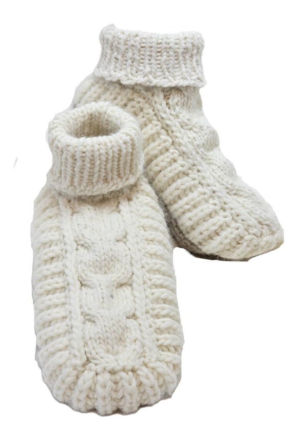Die abgebildeten Kuschelsocken sind aus weißen Garn gestrickt und haben ein auffälliges Zopfmuster auf der Oberseite. Die Sohle ist in einem hellen Grau gearbeitet. Die Socken wirken sehr warm und gemütlich, ideal für kalte Wintertage.