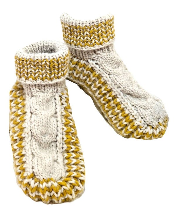 Die abgebildeten Kuschelsocken sind aus weißen Garn gestrickt und haben ein auffälliges Zopfmuster auf der Oberseite. Der Rand der Socken ist mit einem zweifarbigen Muster in Weiß und Curryfarben versehen, das sich auch entlang der Sohle fortsetzt. Die Socken wirken sehr warm und gemütlich, ideal für kalte Wintertage.