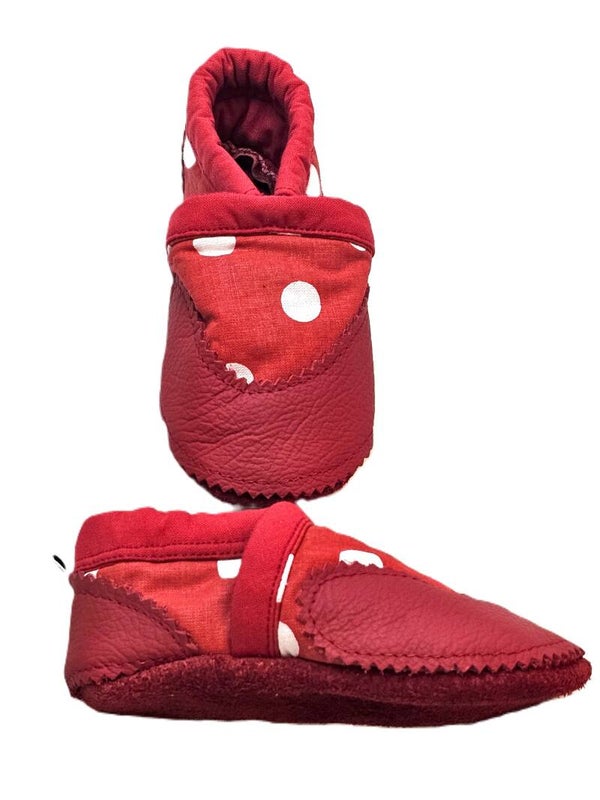 Die Schläppchen auf dem Bild sind rot mit weißen Punkten und haben eine rote lederartige Textur an der Sohle und an den Seiten. Die Oberseite der Schläppchen hat eine dekorative Naht und einen elastischen Einsatz, der das An- und Ausziehen erleichtert. Die Sohle ist aus rotem Leder. Perfekt für gemütliche Tage zu Hause!