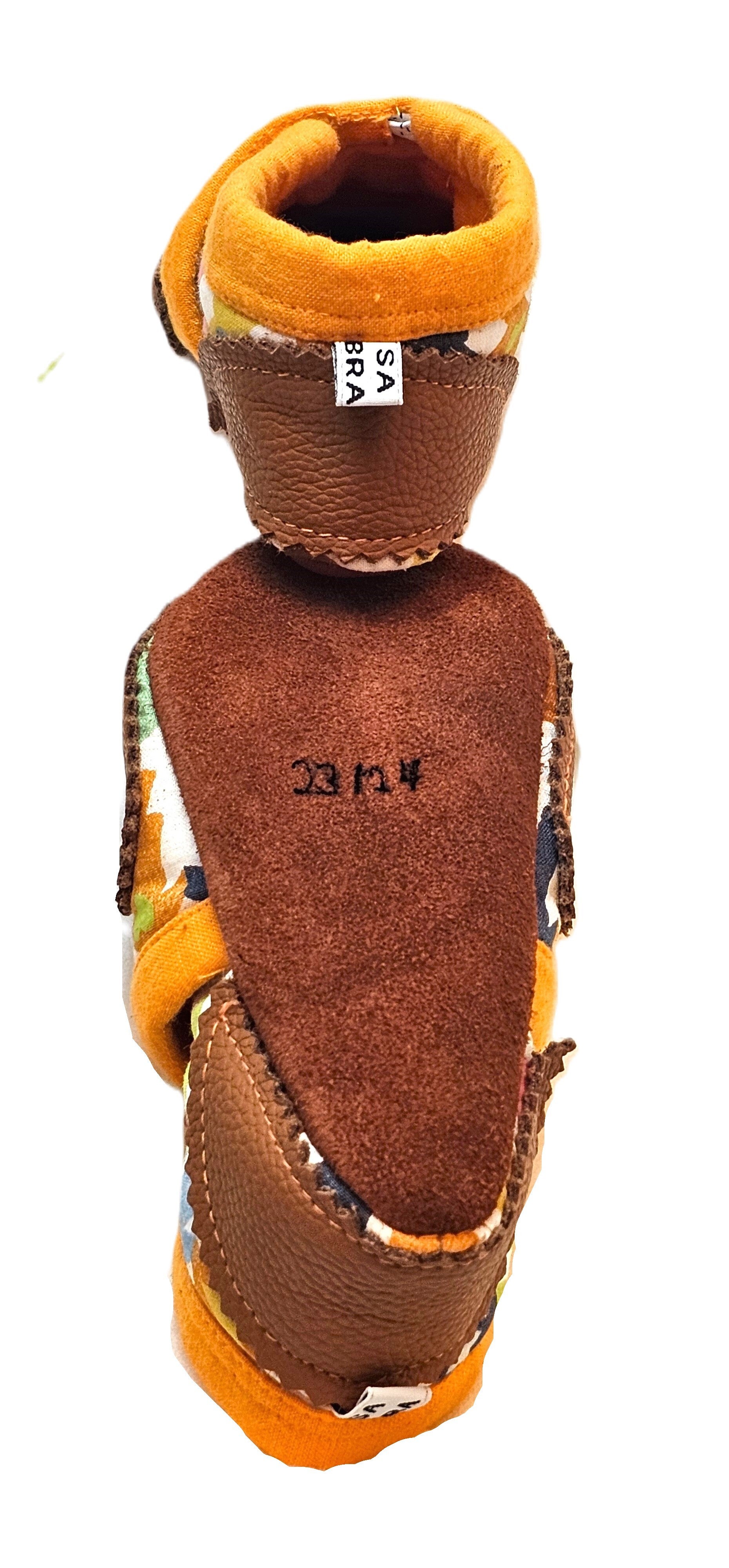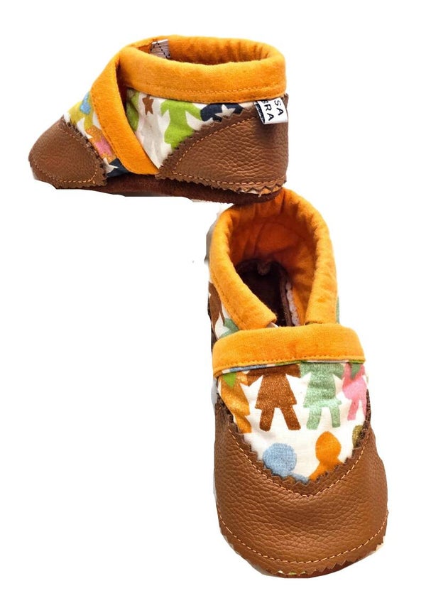 Die Schläppchen auf dem Bild sind aus Baumwollstoff und braunem Leder gefertigt und haben eine orangefarbene Einfassung. Der obere Teil der Schuhe ist mit einem bunten Stoff bedeckt, der verschiedene farbige Figuren in Form von Menschen zeigt. Die Innenseite der Schuhe ist ebenfalls orangefarben. Die Schuhe haben eine weiche und flexible Sohle, die für Kleinkinder geeignet ist.
