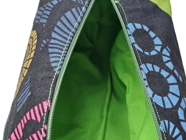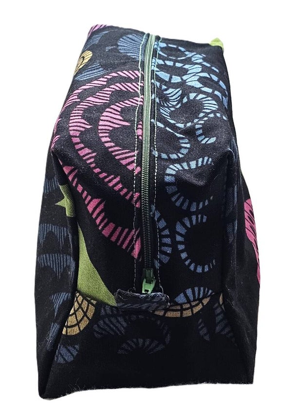 Mit diesem geräumigen Kulturbeutel musst du dir keine Sorgen machen – er bietet genug Platz für all deine Reiseutensilien. Ob Zahnbürste, Shampoo, oder Kosmetikartikel – hier findet alles seinen Platz. Der Kulturbeutel hat ein auffälliges und farbenfrohes Design. Sie besteht aus Stoff und zeigt ein Muster aus kreisförmigen und fächerartigen Formen in Farben wie Schwarz, Grün, Pink und Lila. Die Tasche hat einen Reißverschluss.