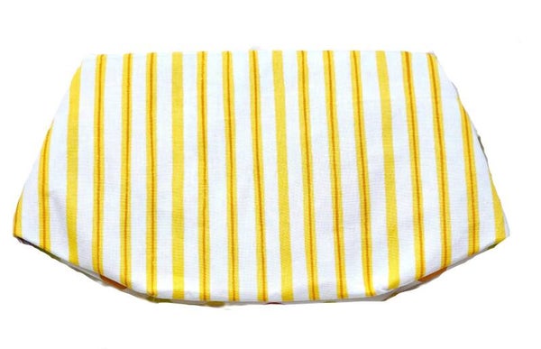 Das Kosmetiktäschchen auf dem Bild ist eine farbenfrohe Clutch mit einer Klappe. Das Hauptmuster der Vorderseite besteht aus bunten Kreisen mit verschiedenen Designs auf weißem Hintergrund. Die Klappe hat gelbe und weiße Streifen und wird mit zwei sichtbaren metallischen Druckknöpfen verschlossen. Der Rand der Klappe ist mit oragefarbenen glänzenden Schrägband eingefasst, das gut zu den Streifen passt. Die Rückseite zeigt ein Muster aus gelben und weißen Streifen. Der Stoff ist glatt und die Streifen verlaufen horizontal.