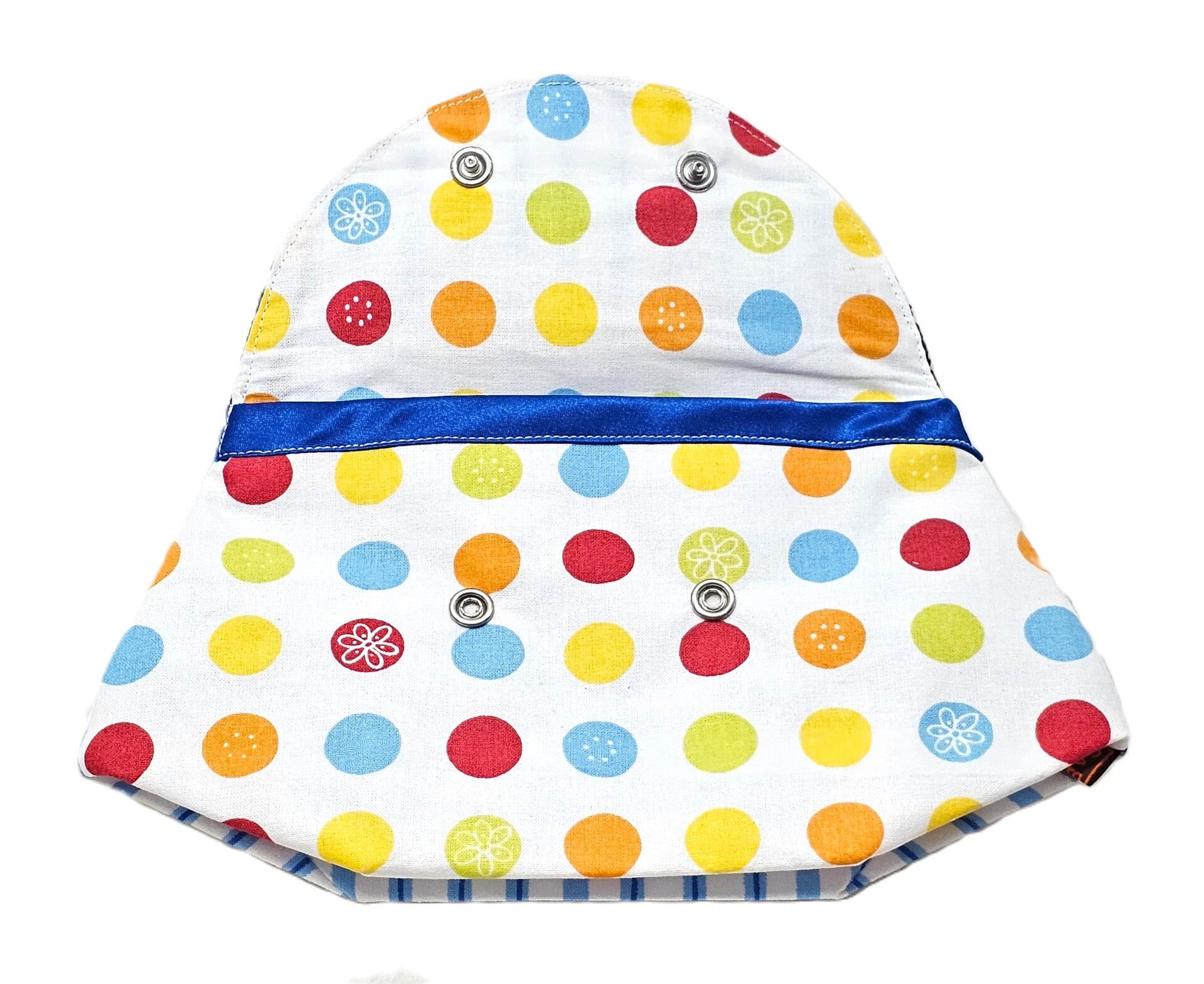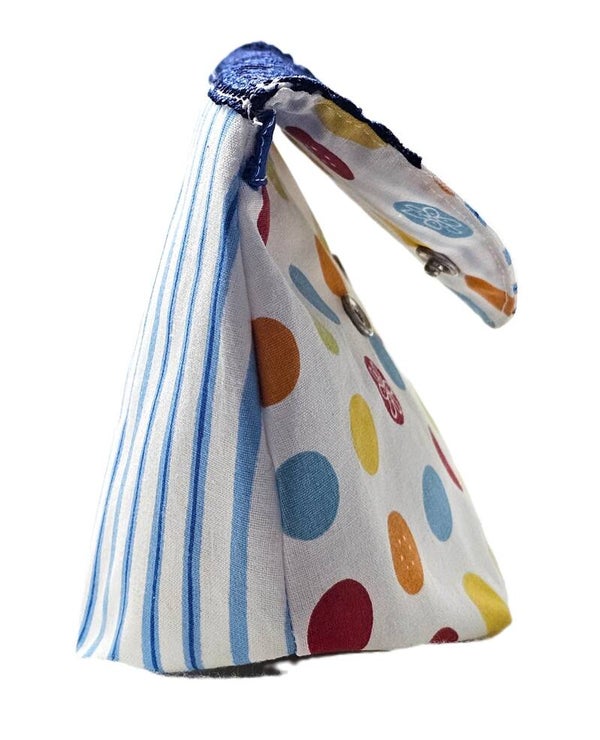 Die Vorderseite des Stoffbeutels zeigt ein lebhaftes Punktemuster mit großen Kreisen in Blau, Grün, Gelb und Rot. Einige Kreise haben zusätzliche Muster wie Blumen und Schneeflocken. Am oberen Rand befindet sich eine dunkelblaue Spitzenborte mit zwei metallischen Druckknöpfen darunter. Die Rückseite des Stoffbeutels zeigt ein gestreiftes Muster in Blau und Weiß.