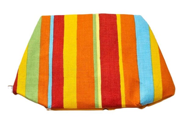 Die Vorderseite des Stoffbeutels hat eine leuchtend orangene Grundfarbe mit einem Muster aus bunten Kreisen und blumenähnlichen Formen, die über die gesamte Fläche verteilt sind. Der Überschlag des Beutels ist mit horizontalen Streifen in verschiedenen Farben wie Rot, Orange, Grün und Weiß gestaltet. Die Rückseite des Beutels zeigt ein buntes Streifenmuster in verschiedenen Farben wie Gelb, Rot, Orange, Blau und Grün.