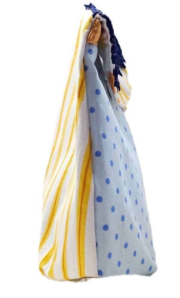 Die Vorderseite des Stoffbeutels hat eine hellblaue Farbe mit einem Muster aus kleinen, gleichmäßig verteilten dunkelblauen Punkten. Der obere Überschlag des Beutels ist mit einer dunkelblauen Spitzenborte verziert und hat einen metallischen runden VDruckknopfverschluss. Unterhalb der Spitze befindet sich eine gelb-weiß gestreifte Stoffbahn, die einen Kontrast zum hellblauen Stoff und der dunkelblauen Spitze bildet. Die Rückseite des Stoffbeutels zeigt ein gelb-weiß gestreiftes Muster mit dunkelblauer Spitze entlang der oberen Kante.