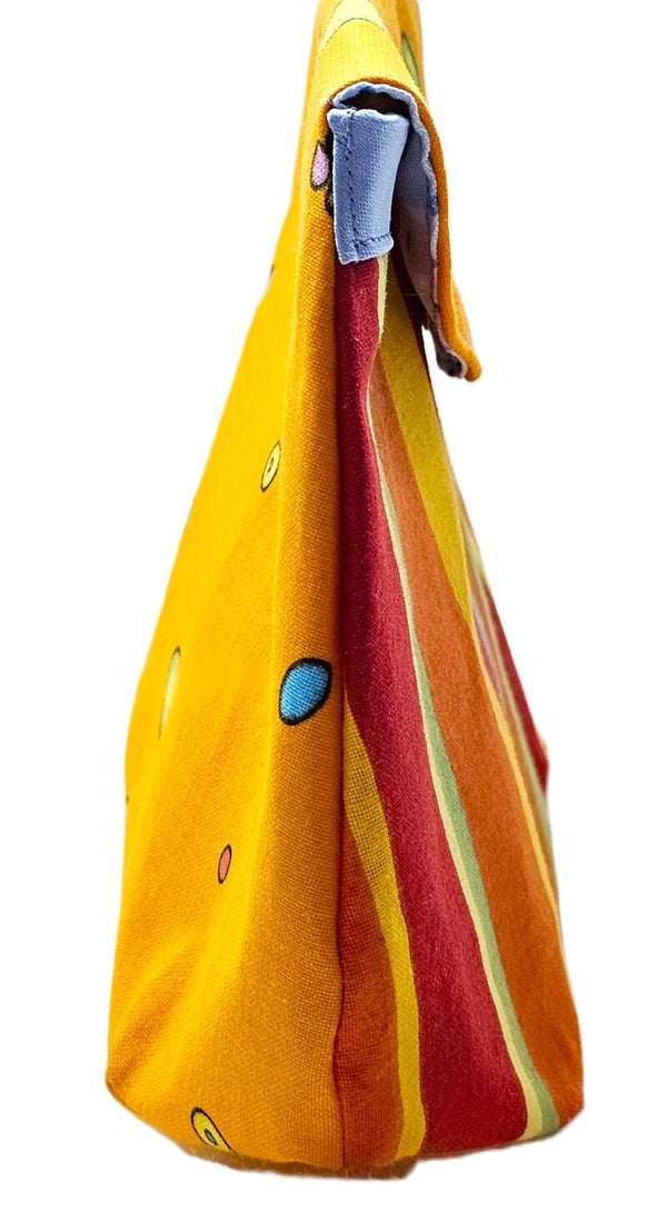 Die Vorderseite des Stoffbeutels hat horizontale Streifen in verschiedenen Farben wie Rot, Orange, Grün und Blau. Die Klappe des Beutels ist leuchtend orange und mit bunten Kreisen und Blumen verziert.