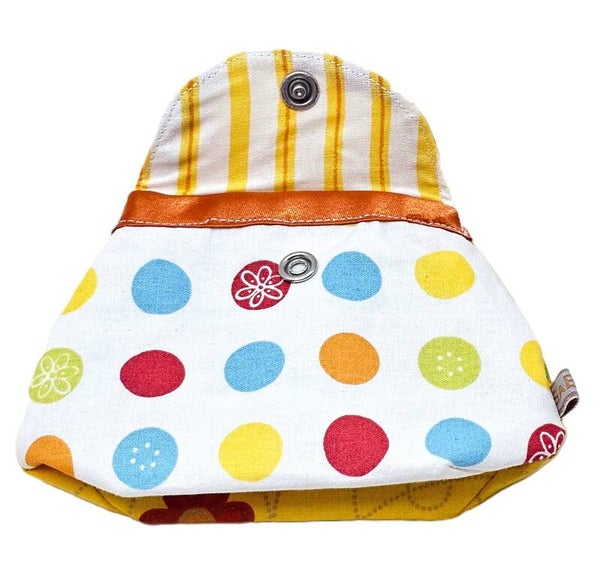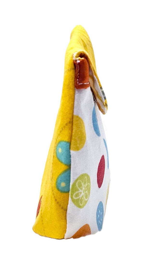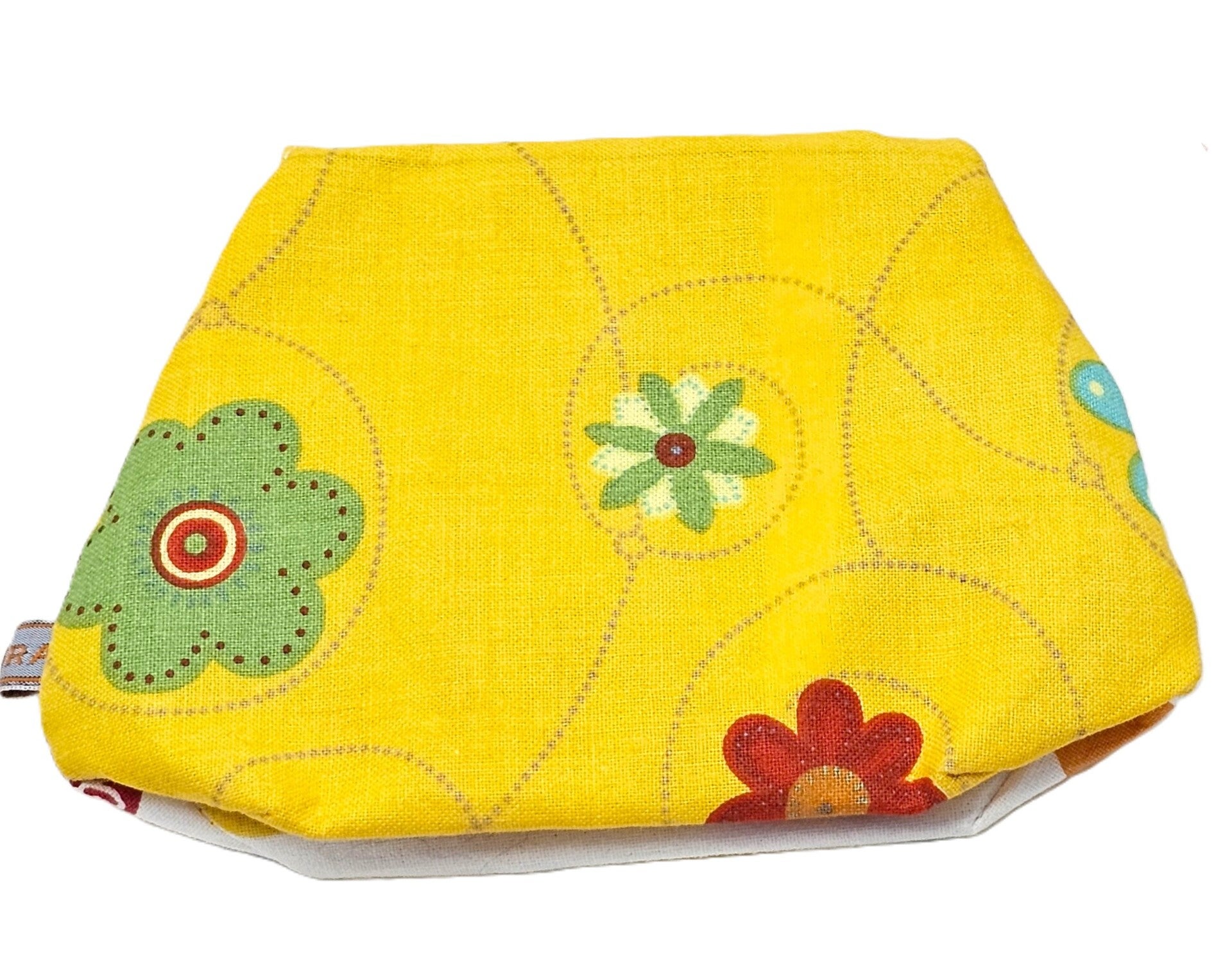 Die Vorderseite des Stoffbeutels zeigt ein buntes Muster mit mehreren Kreisen in verschiedenen Größen und Farben wie Blau, Rot, Grün und Gelb. Der Beutel hat eine Klappe mit einem gelben Stoff und einem metallischen Druckknopf. Die Rückseite des Stoffbeutels ist gelb und mit einem floralen Muster versehen. Die Blumen sind in verschiedenen Farben wie Grün, Blau und Rot gestaltet, wobei eine zentrale Blume besonders hervorsticht.