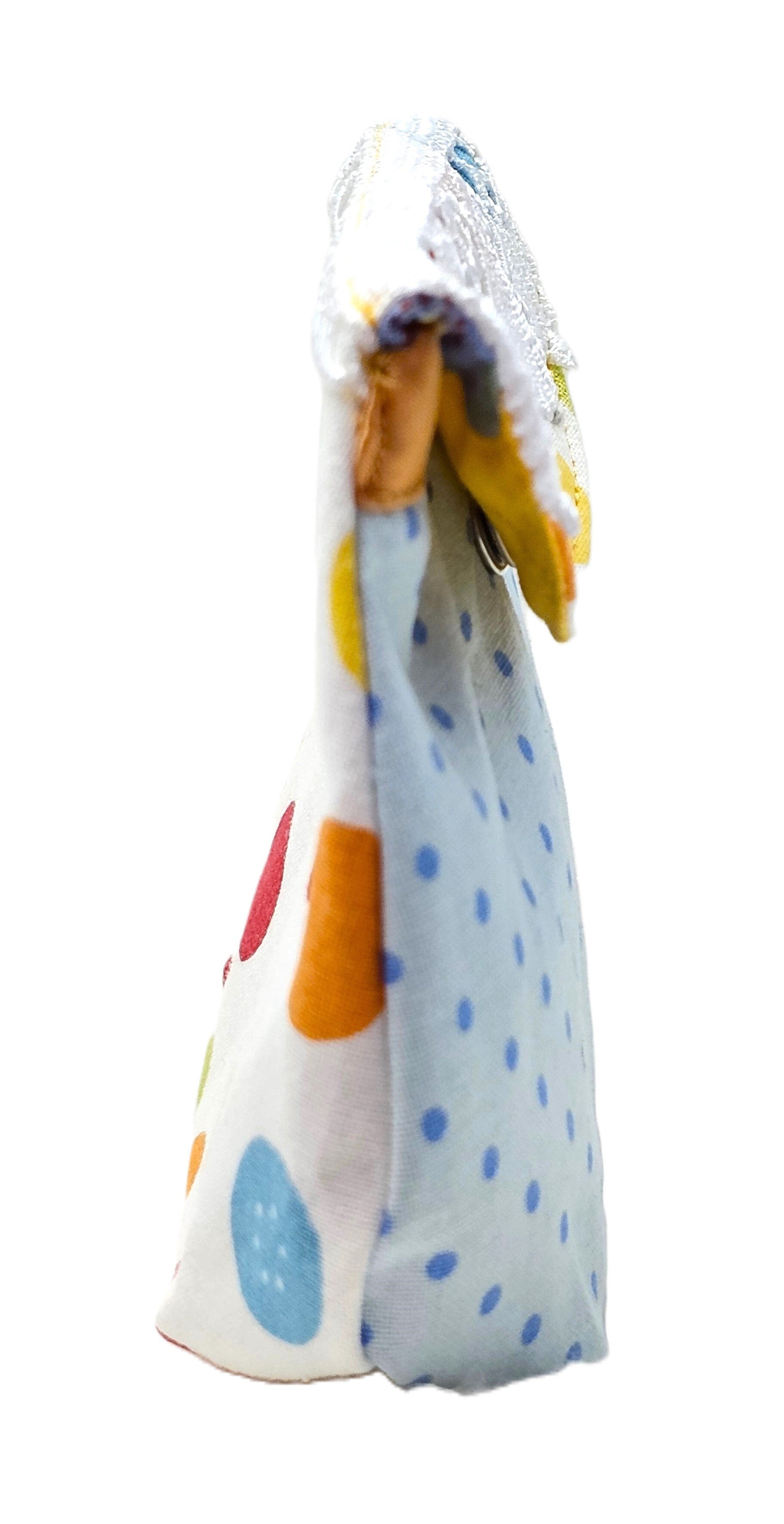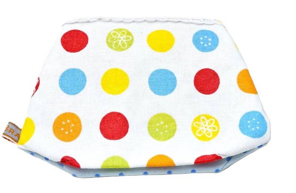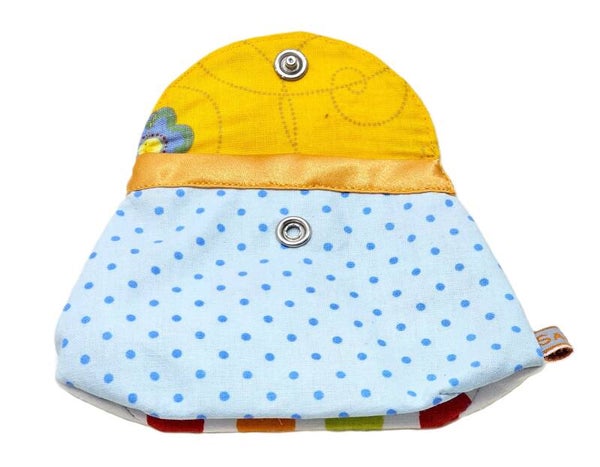 Die Vorderseite des Stoffbeutels zeigt ein lebhaftes Design mit blauen Punkten auf einem hellblauen Hintergrund. Die Klappe des Beutels hat eine dekorative Umrandung mit verschiedenen Streifen und Mustern, einschließlich floraler Elemente. Darunter erkennt man viele bunte Kreise in den Farben Blau, Gelb, Rot und Grün. Durch den metallischen Druckknopf wird der Stoffbeutel verschlossen. Die Rückseite des Stoffbeutels zeigt ein farbenfrohes Muster aus Punkten und Blumen auf weißem Hintergrund.