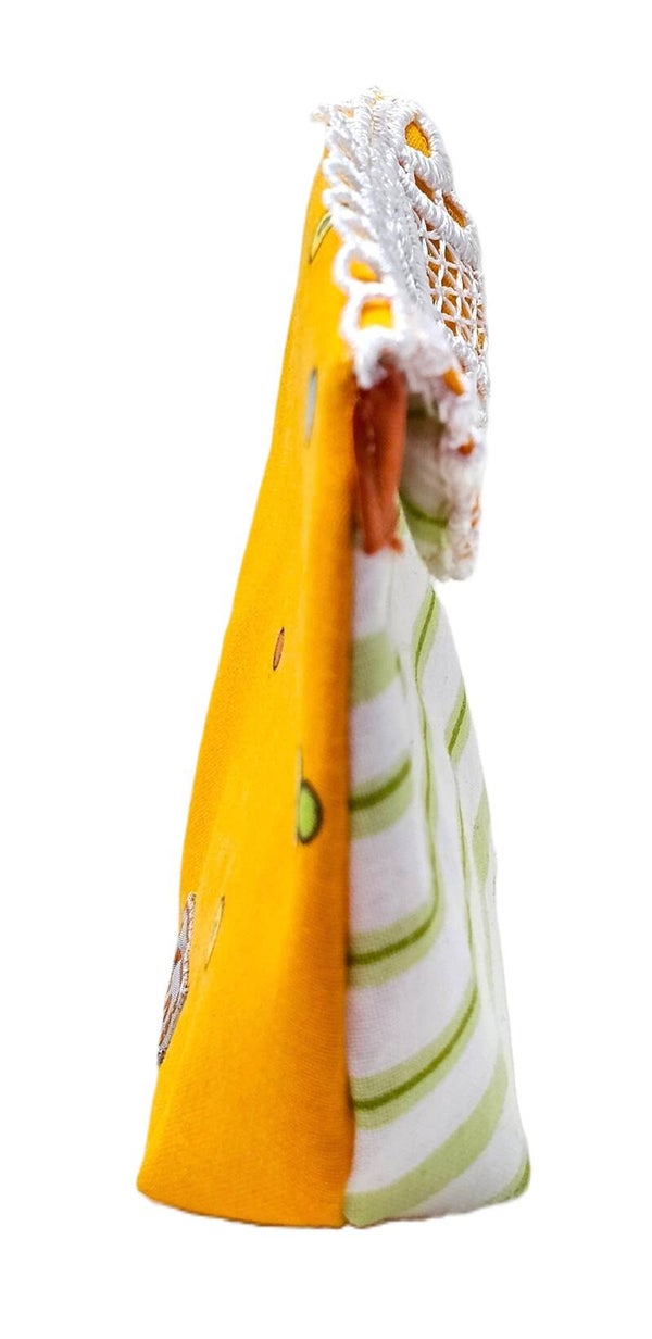 Die Vorderseite des Stoffbeutels zeigt ein gestreiftes Muster mit abwechselnden horizentralen grünen und weißen Streifen. Am oberen Rand des Beutels befindet sich eine Spitzenborte, die überwiegend orange ist und gelbe Kreismuster aufweist. Unter der Borte befindet sich ein metallischer Druckknopf. Die Rückseite des Stoffbeutels zeigt ein orangenes Design mit dekorativen aufgedruckten Elementen. Es gibt bunte Knöpfe und gestickte Muster, darunter auch Kreise.