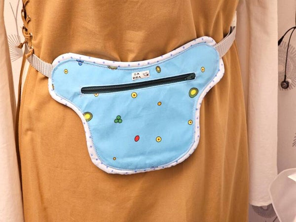 Die Gürteltasche hat an der engsten Stelle, von links nach rechts außen gemessen, eine Breite von etwa 16 cm. Die Öffnung des Reißverschlusses ist ungefähr 17,5 cm breit.