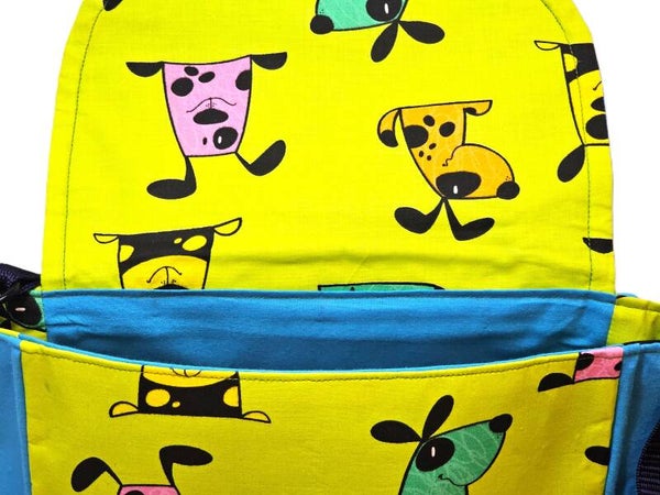 Kindergarten Tasche in leuchtend grünem Hintergrund mit Cartoon-Hundegesichtern und türkis , KiTa4