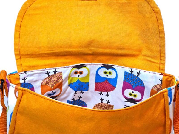 Kindergarten Tasche in orange und einem verspielten Design mit verschiedenen stilisierten Eulen in mehreren Farben, KiTa6