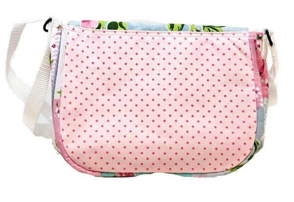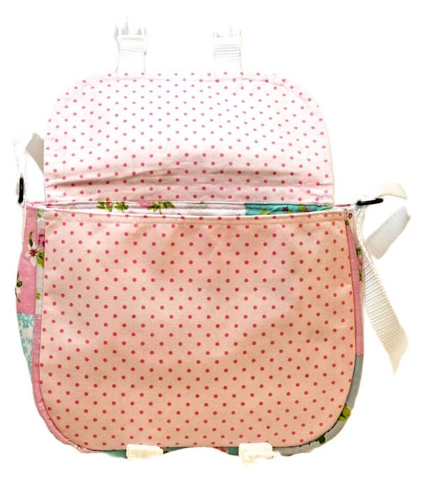 Die Kindergartentasche auf dem Bild ist bunt und hat ein Blumen- und Punktmuster. Sie hat ein Fassungsvermögen von etwa 6 Litern und verfügt über weiße Steckschnallen. Der Tragegurt ist ebenfalls weiß und kann von 50 cm auf 94 cm verlängert werden. Das Innenfutter hat ein Patchwork Design mit verschiedenen Blumen und zarten Farben von zartrosa bis helltürkis.
