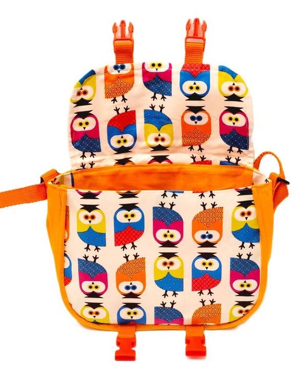 Die Kindergartentasche auf dem Bild ist sehr farbenfroh und hat ein verspieltes Design mit verschiedenen stilisierten Eulen in mehreren Farben auf einem weißen Hintergrund. Die Vorderklappe ist in einem orange gehalten. Genau so sieht das Innerfutter aus. Die Tasche hat orangefarbene Steckschnallen und einen orangefarbenen, verstellbaren Tragegurt, der von 50 cm auf 94 cm erweitert werden kann. Das Design ist auffällig und ansprechend für Kinder, und die verstellbare Länge des Gurtes macht die Tasche vielseitig für verschiedene Größen und Altersgruppen. Die Tasche hat ein Fassungsvermögen von ca. 6 Litern, was sie ideal für den Kindergartenalltag macht. Perfekt für kleine Abenteurerinnen und Abenteurer!
