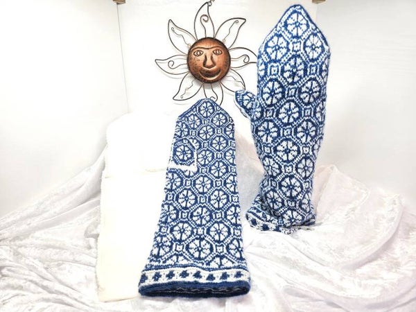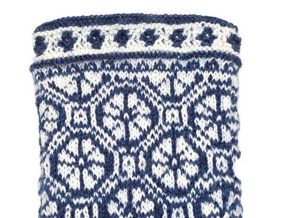 Handarbeit: Diese Fäustlinge sind von Hand gestrickt. Die sorgfältige Arbeit zeigt sich in den filigranen Details und den komplexen Mustern.
