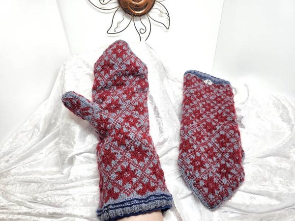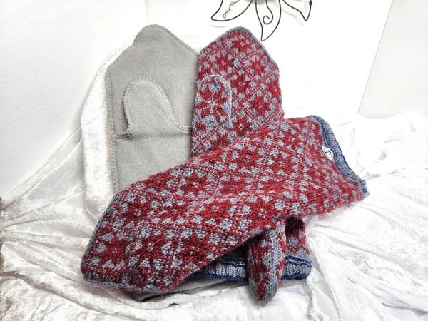 Handarbeit: Diese Fäustlinge sind von Hand gestrickt. Die sorgfältige Arbeit zeigt sich in den filigranen Details und den komplexen Mustern.
