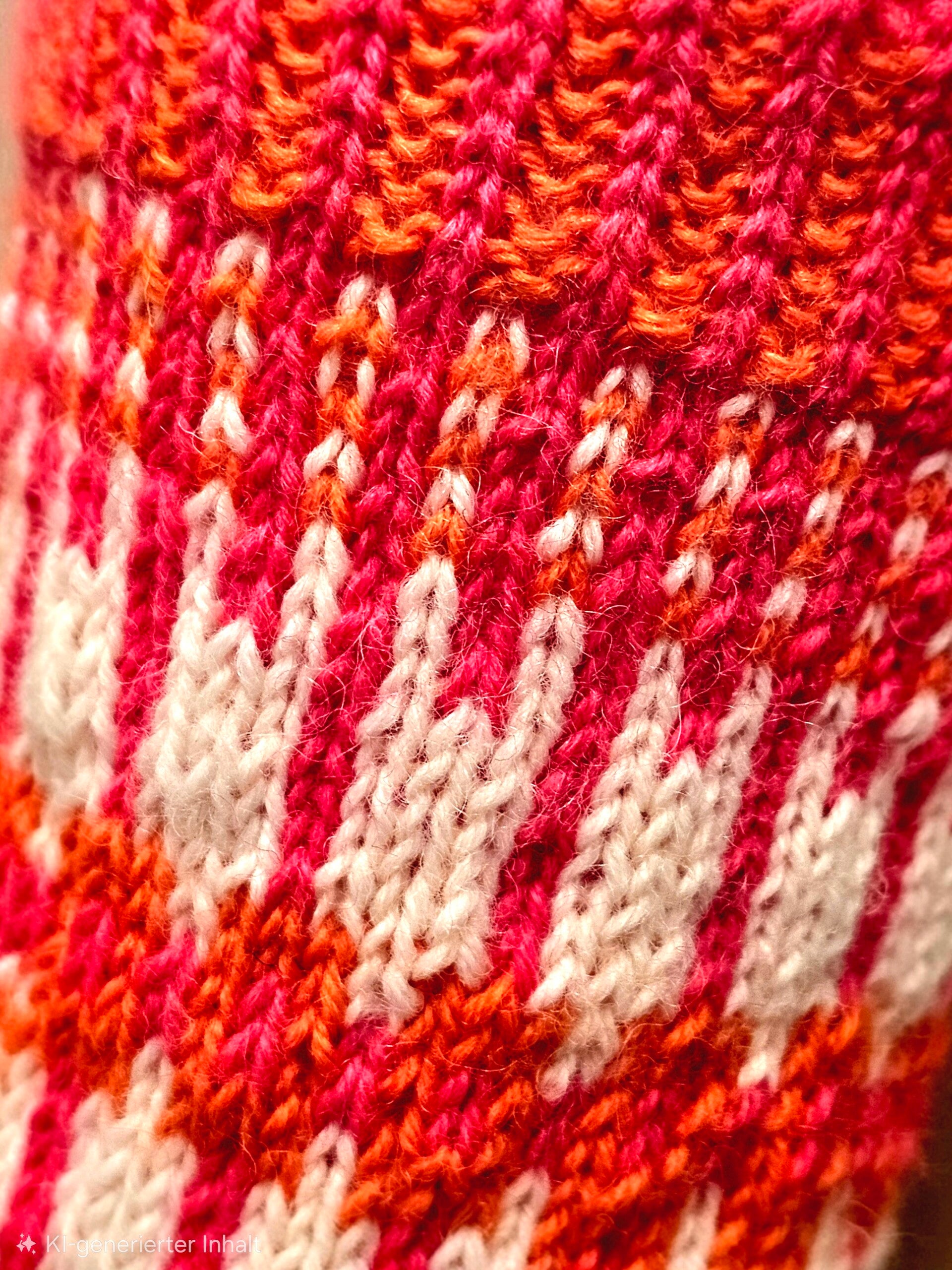 Diese handgestrickten Strümpfe in Größe 40/41 sind echte Einzelstücke – frisch, farbenfroh und mit Liebe gefertigt. Der Fußbereich in klassischem Weiß sorgt für eine ruhige Basis, während der Schaft mit kräftigem Pink und leuchtendem Orange ein verspieltes Farbstatement setzt. Das Muster aus Streifen und Karos verleihen den Strümpfen eine moderne, kreative Note.